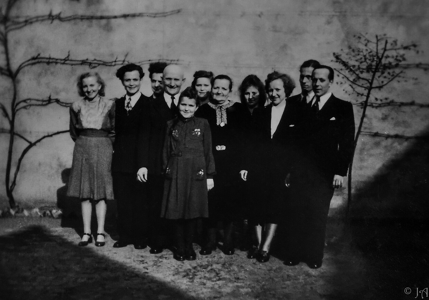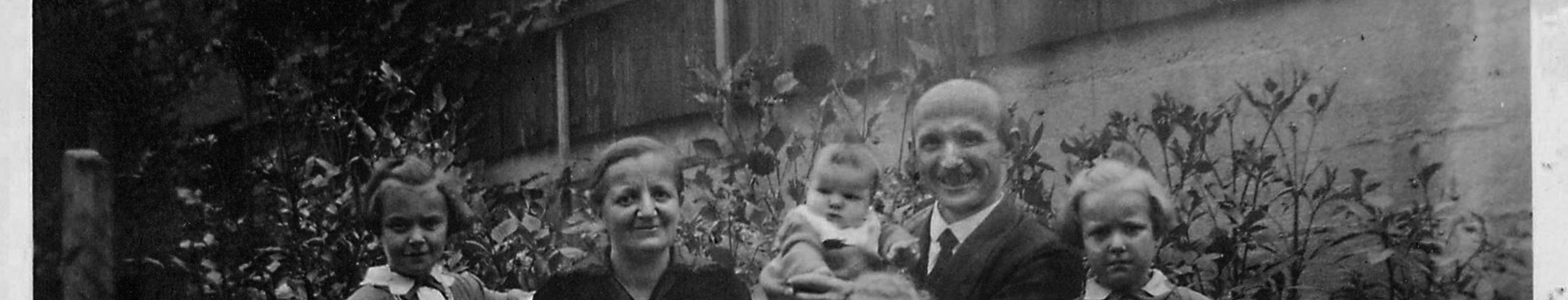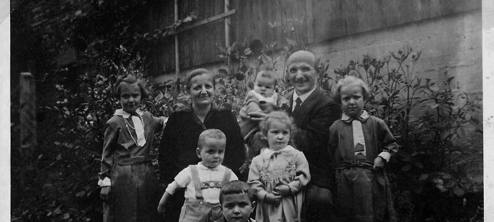 1 Familienbild von 1931: Vorne Franz, dahinter Jakob und Katharina, hintere Reihe Julchen, Mama Katharina, Baby Lisbeth, Papa Anton und Maria (Margot fehlt noch)