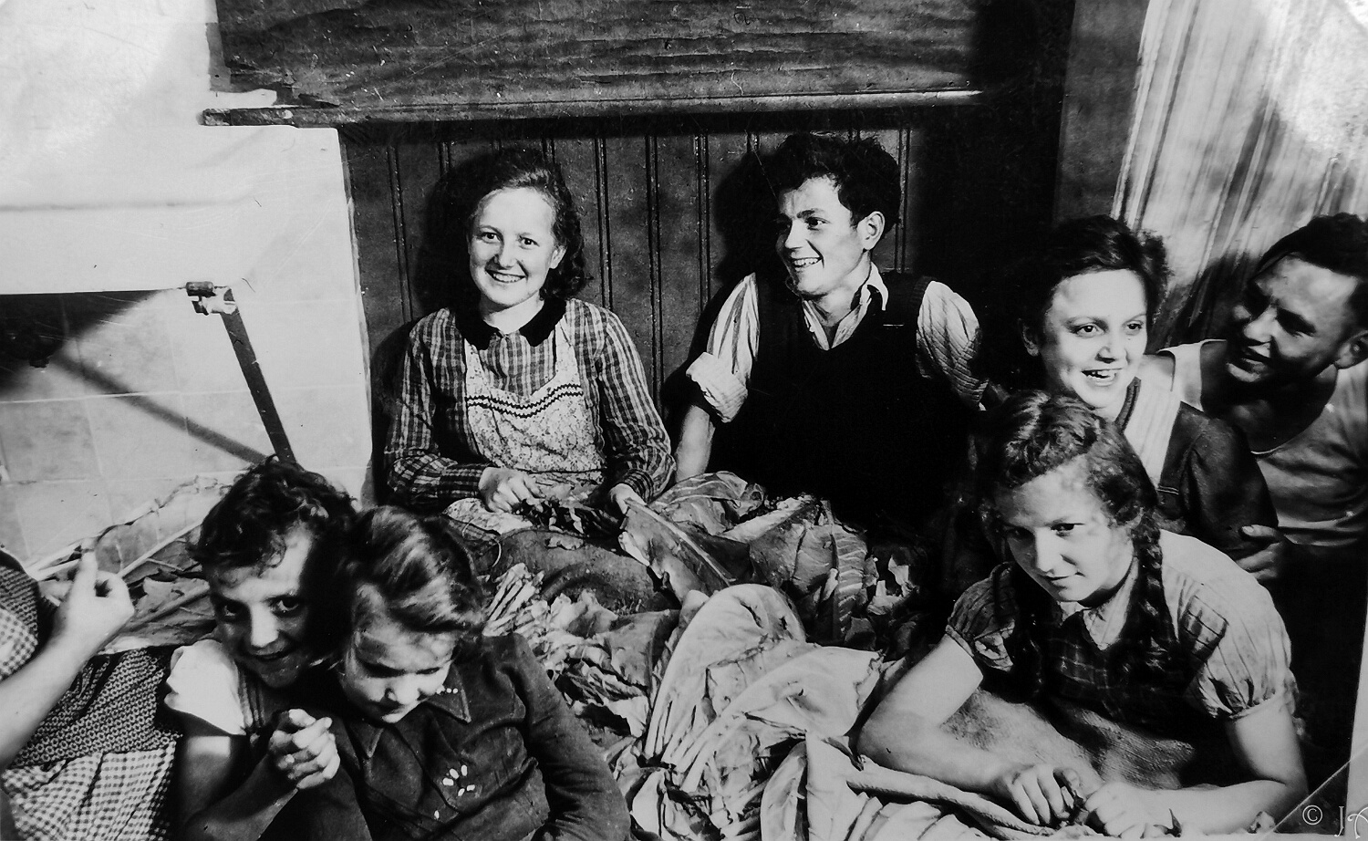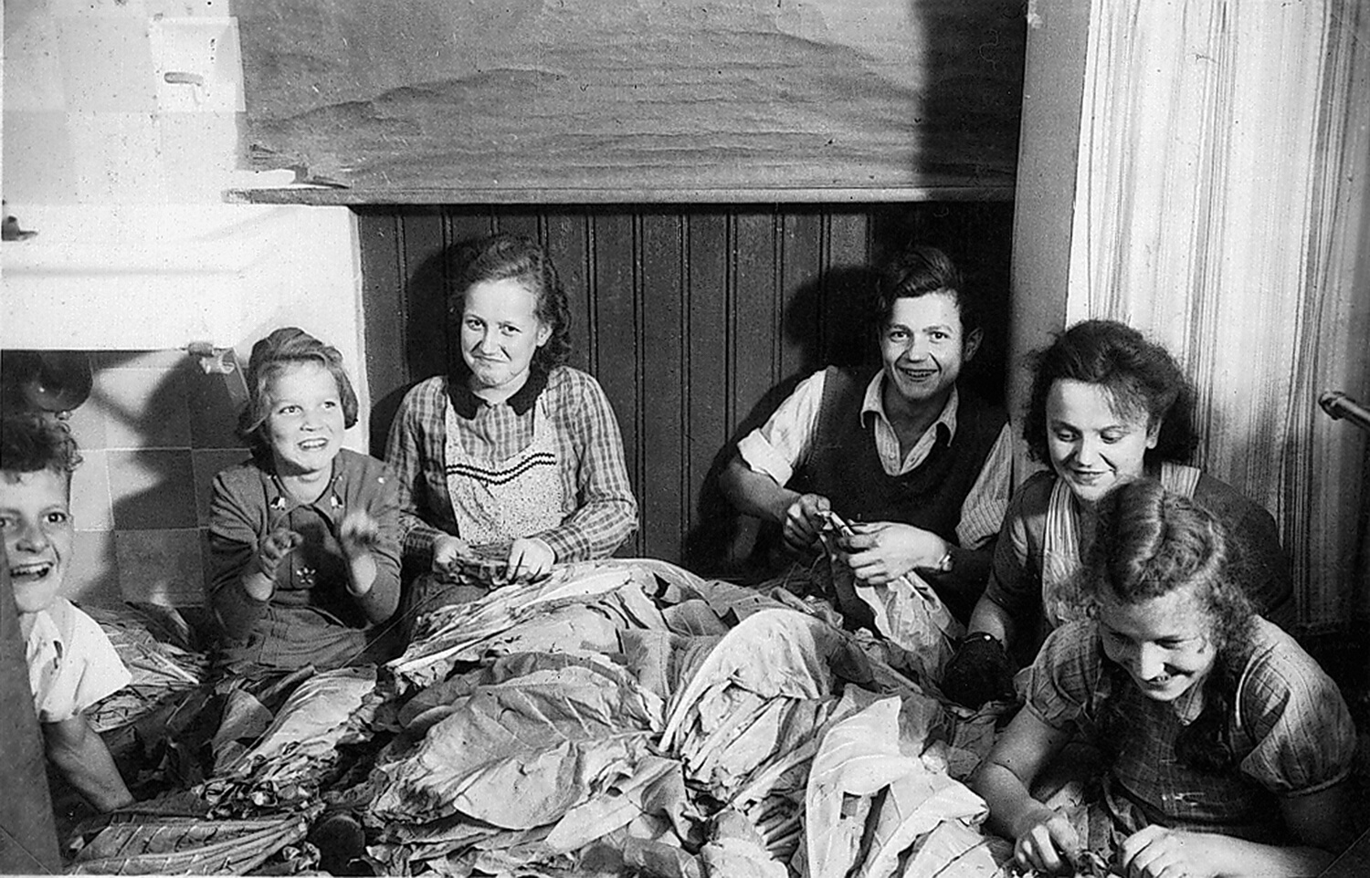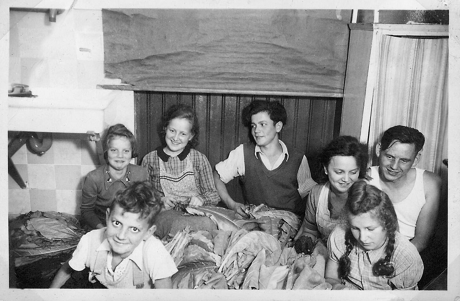 5 Beim Tabak nähen: (v. links nach rechts): Jakob, Lisbeth, Maria, Franz, Julchen, Katharina